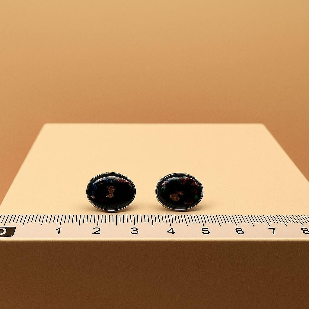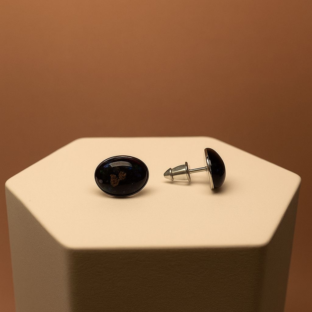 Timeless and celestial, the Galaxy Oval Stud Earrings capture the beauty of distant galaxies in a sleek oval design. Handcrafted with a glossy black resin base, enriched with cosmic flecks of color and subtle golden sparkles, they bring a refined touch of the universe to your everyday style.