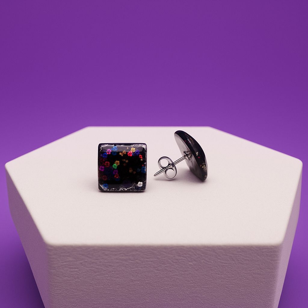 Step into the cosmos with our Galaxy Sparkle Square Earrings. Handcrafted with a deep black resin base and scattered with vibrant multicolored glitter, these earrings resemble a night sky filled with stars and galaxies. Bold, artistic, and enchanting, they are the perfect statement studs for dreamers and stargazers.